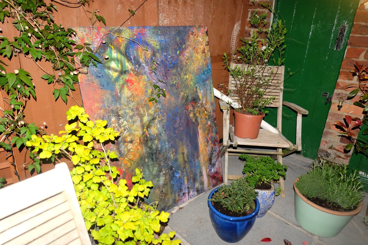 Her materials are as eclectic as her inspirations. From graffiti sprays like Liquitex and Windsor & Newton, to everyday objects like highlighters and makeup, Clo uses whatever is around her. In one piece, she even blended eye shadows into the acrylics to achieve the perfect tone. Texture plays a huge role too—dried leaves and petals often find their way into her work, crumbled into texture paste or mixed into her own concoctions of glue, paint, and natural elements. If she runs out of traditional supplies, she'll improvise with wall fillers, plaster, or even gravel. Metal paints, with their drips and shine, are another favorite, giving her pieces a unique, reflective quality.