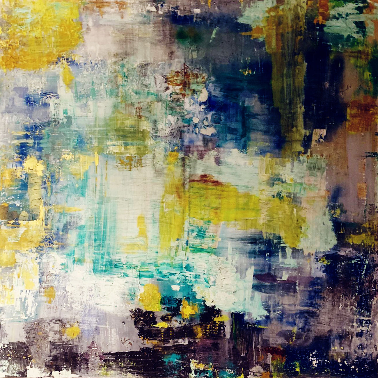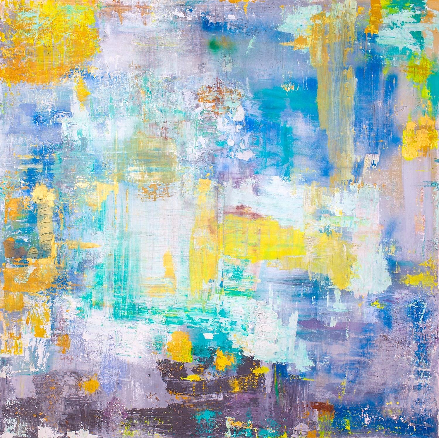 Description: Resonance of Hope is filled with light, bright colours—yellows, purples, and vivid greens—that seem to rise and break through the darker, more muted underlayers. Clo uses spoons and cloths to create sweeping motions across the canvas, symbolizing the lifting of darkness to reveal light and optimism. The textures are soft but persistent, embodying the quiet yet powerful nature of hope. Each brushstroke seems to push upward, mimicking the way hope can lift the spirit even in difficult times. The piece resonates with a sense of renewal and faith in the future, a gentle reminder that despite the weight of reality, hope is always present, even if just beneath the surface.