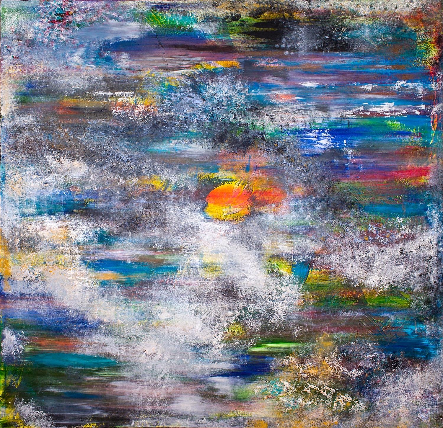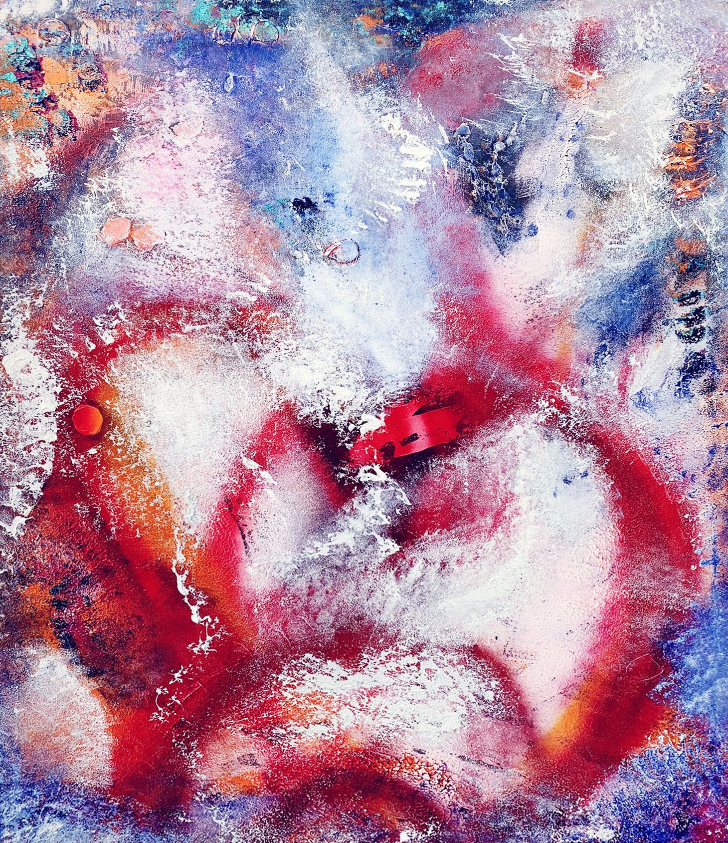 Description: The deep red and orange backdrop of Star Love evokes a sense of fire, passion, and cosmic energy. Specks of blue, bright yellows, and blacks are scattered across the composition, like distant stars and planets in the aftermath of a celestial explosion. The swirling combination of these colors gives the impression of an explosion from the cosmos—a supernova bursting into existence, radiating energy throughout time and space. The use of rich, contrasting tones highlights the idea that echoes of past experiences, thoughts, and emotions reverberate eternally, shaping our future while remaining rooted in the depths of our personal and universal histories.