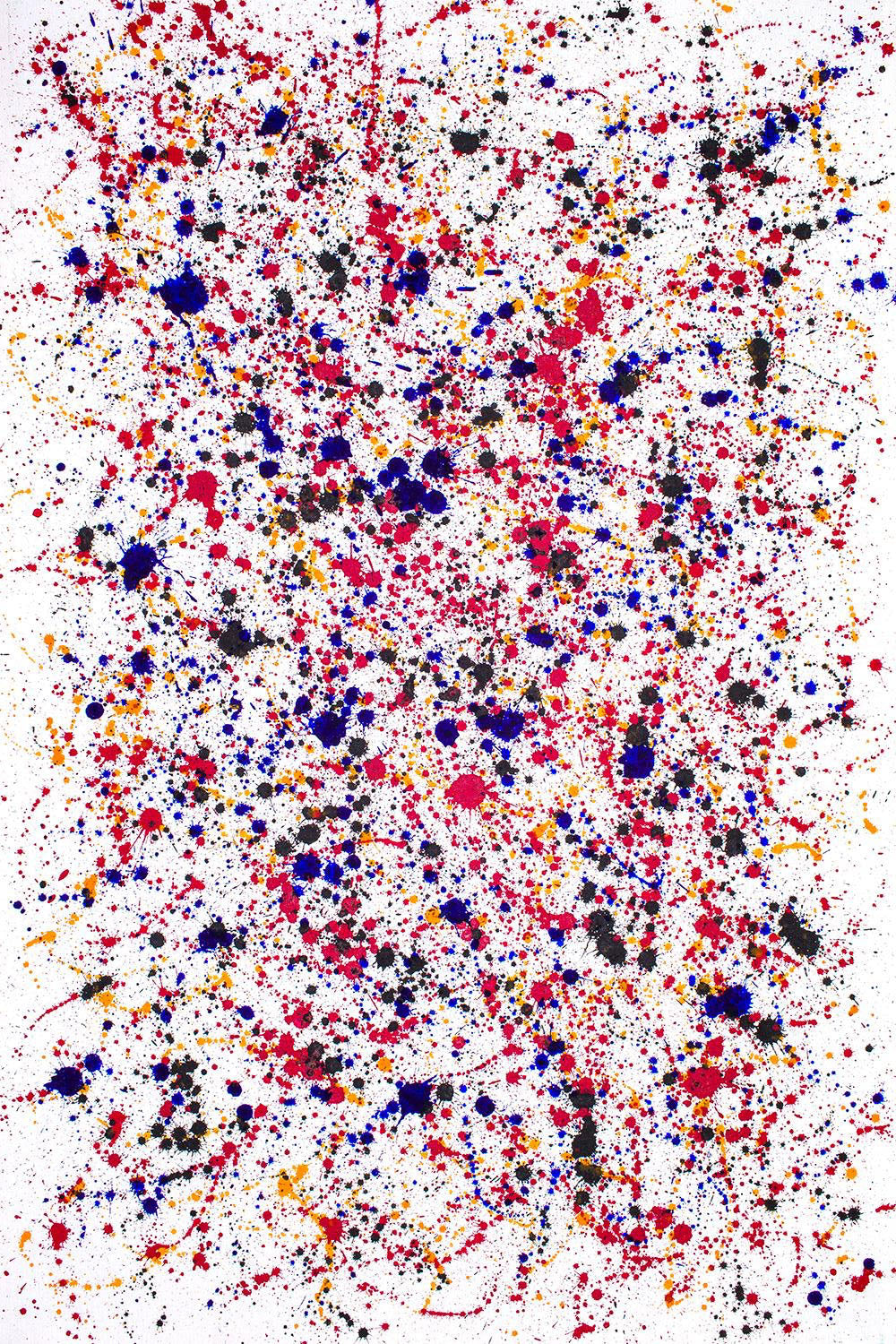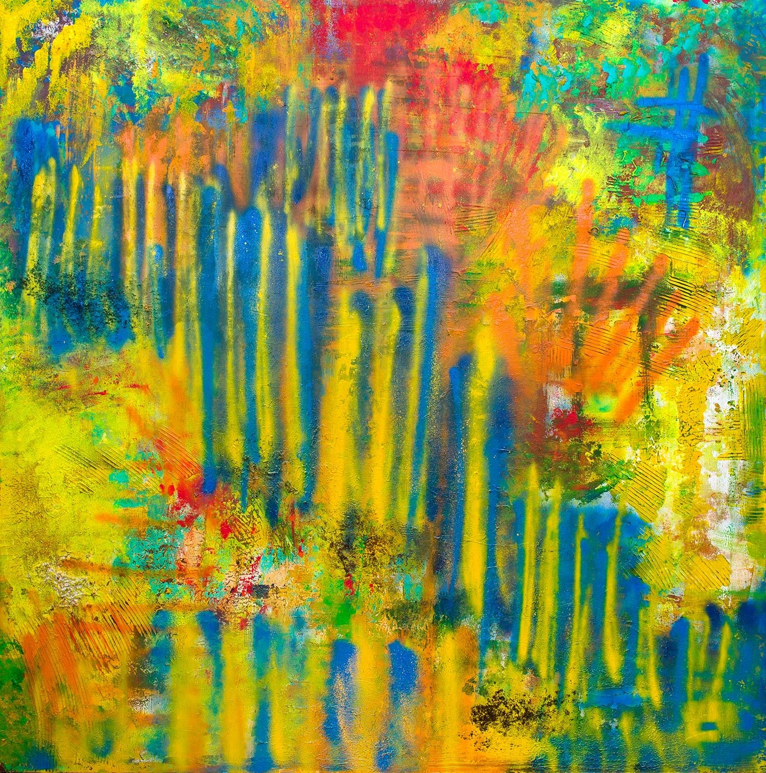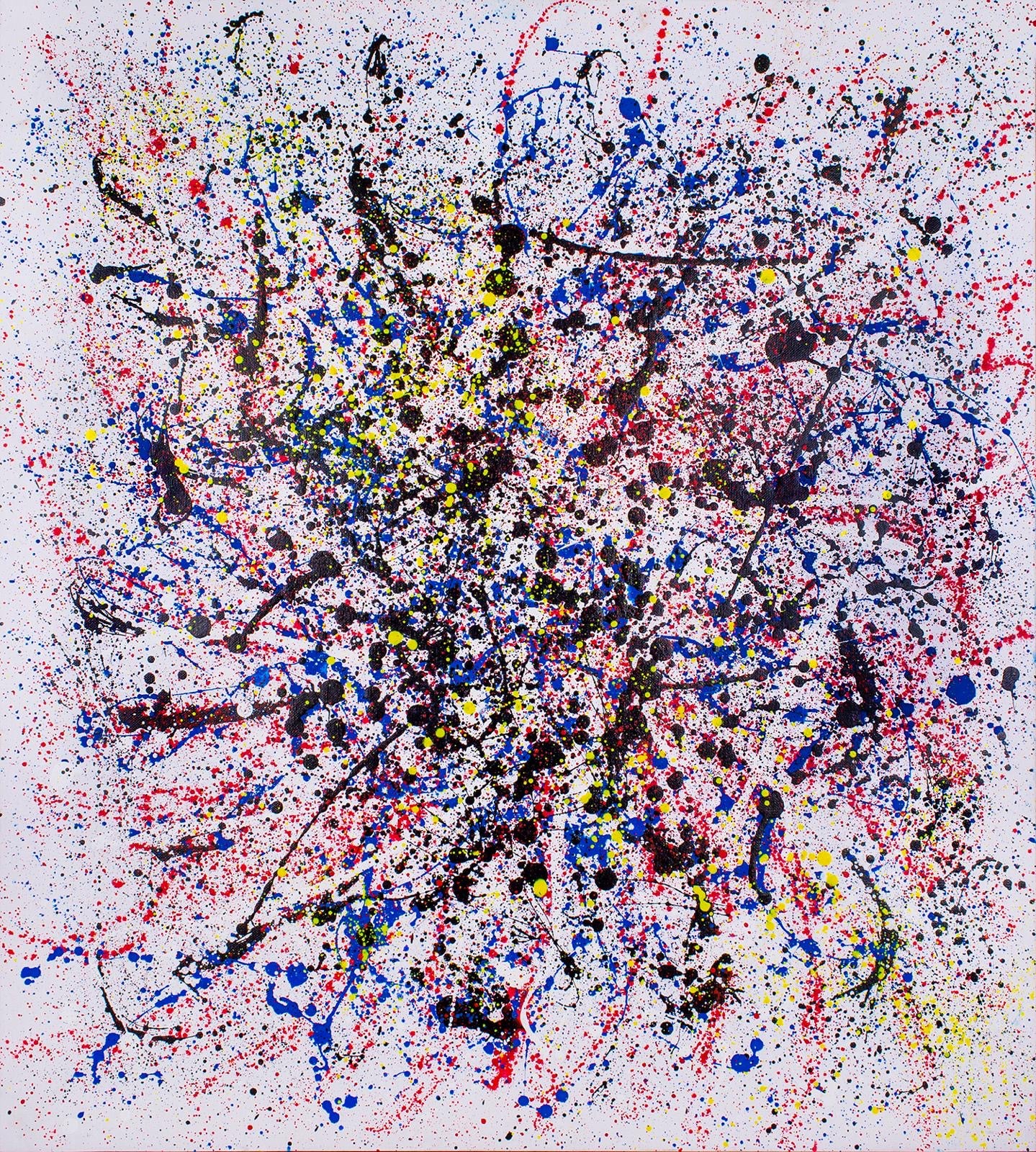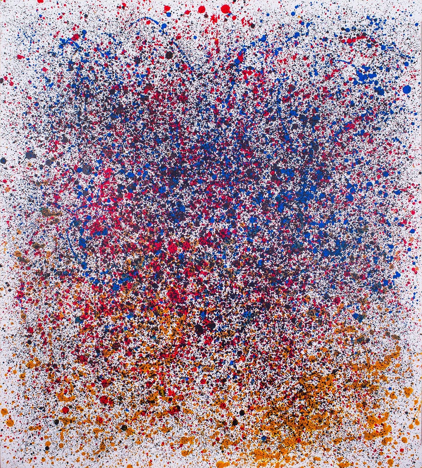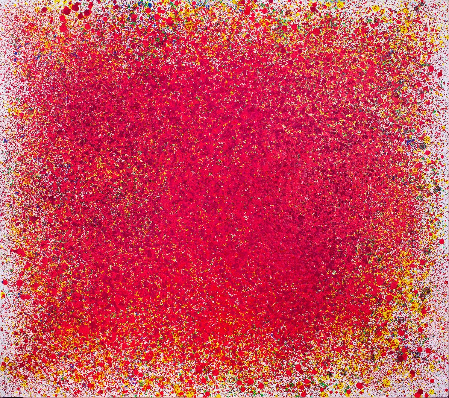 Description: Vibrations is a powerful and intense composition, with the majority of the canvas dominated by deep, rich red specks and splashes of color, building up the bulk of the painting's center. From this dense, fiery core, the colors explode into bright yellows, radiating outward, like energy waves pulsing through the universe. The outer corners of the piece are framed with a stark white background, providing space for the intensity of the center to breathe and expand. This contrast between deep reds and yellows, and the white corners, creates a sense of energetic resonance, as if the painting itself is vibrating with life and motion. It reflects how passion and emotion can build within us and then explode outward, affecting everything around us.