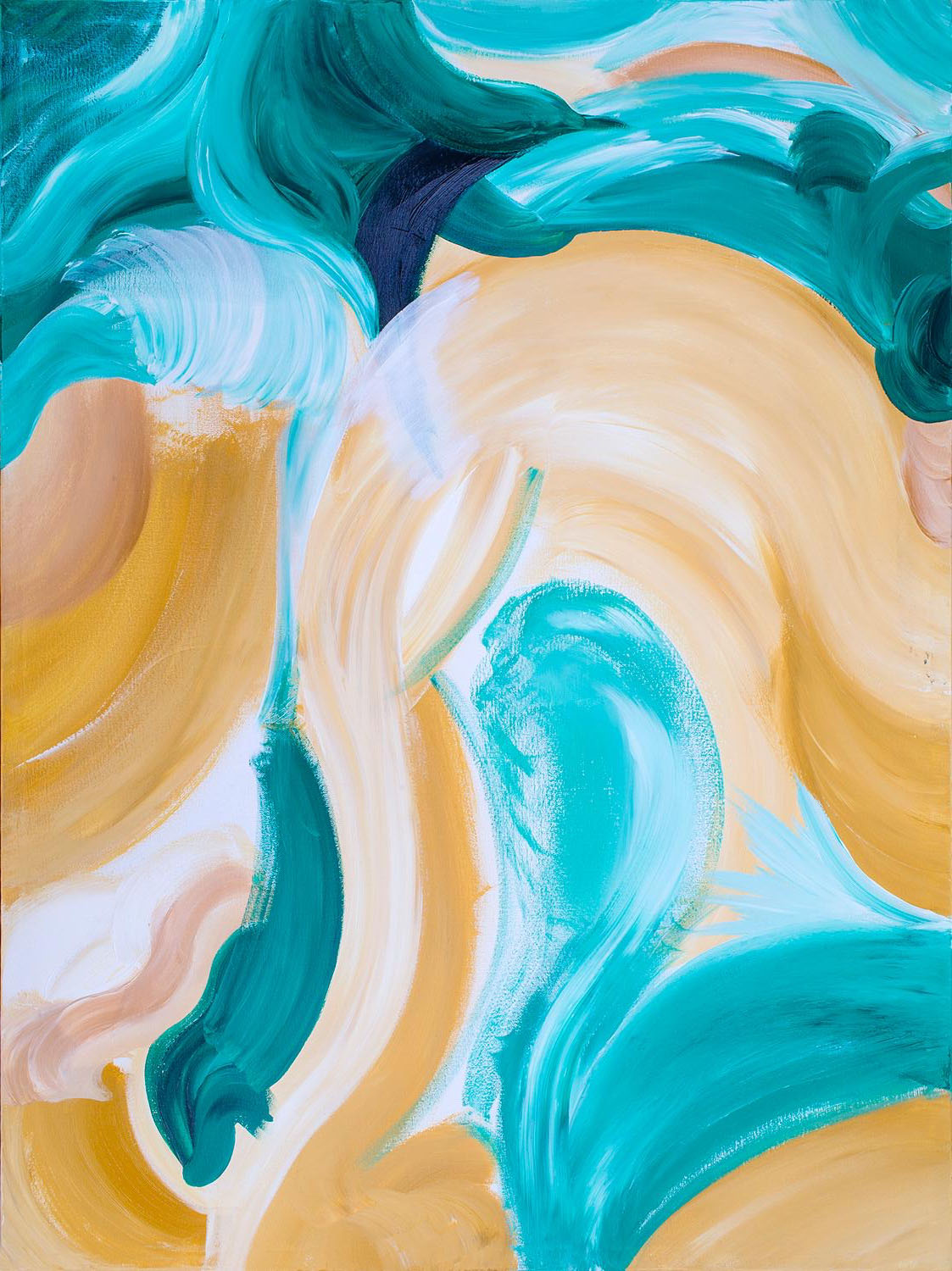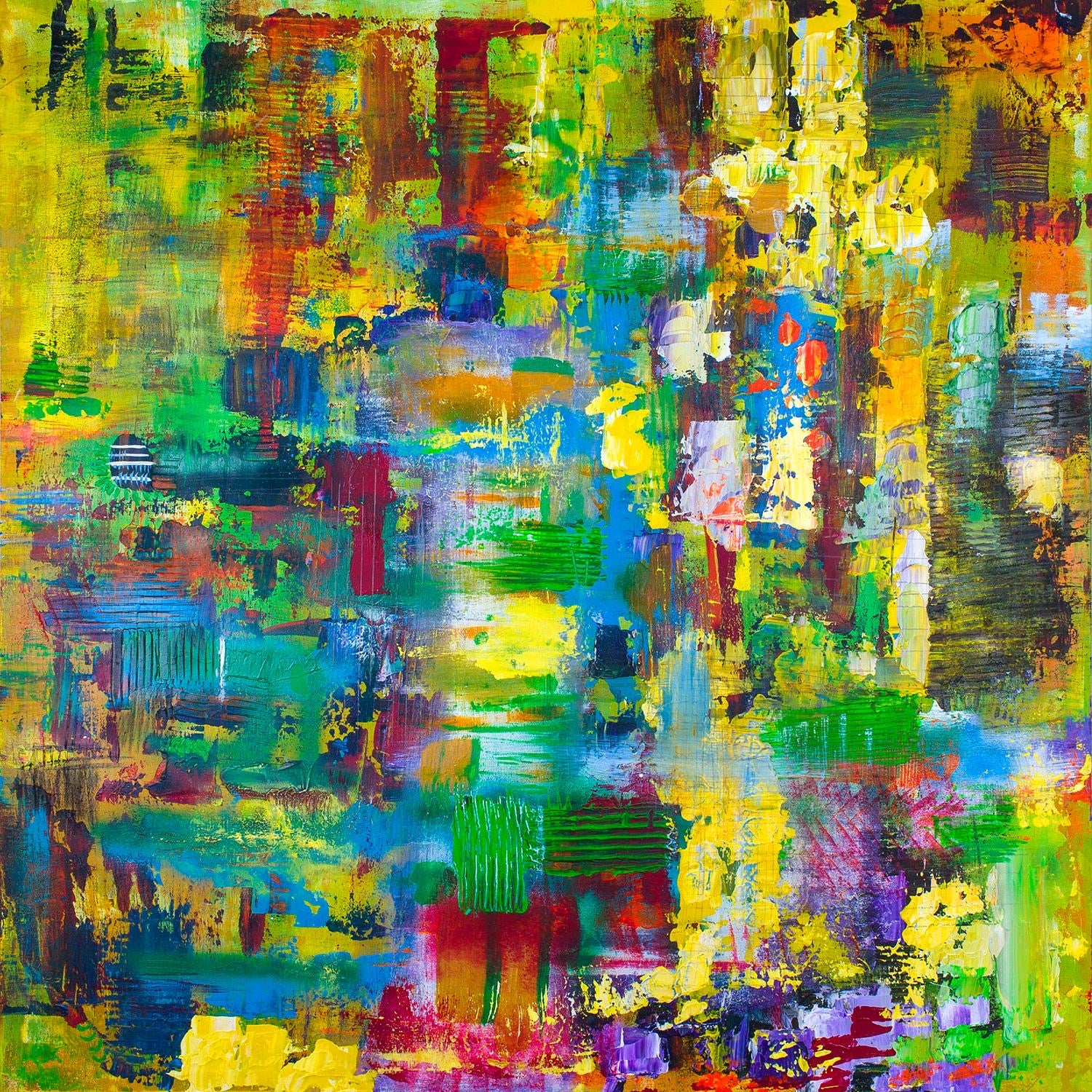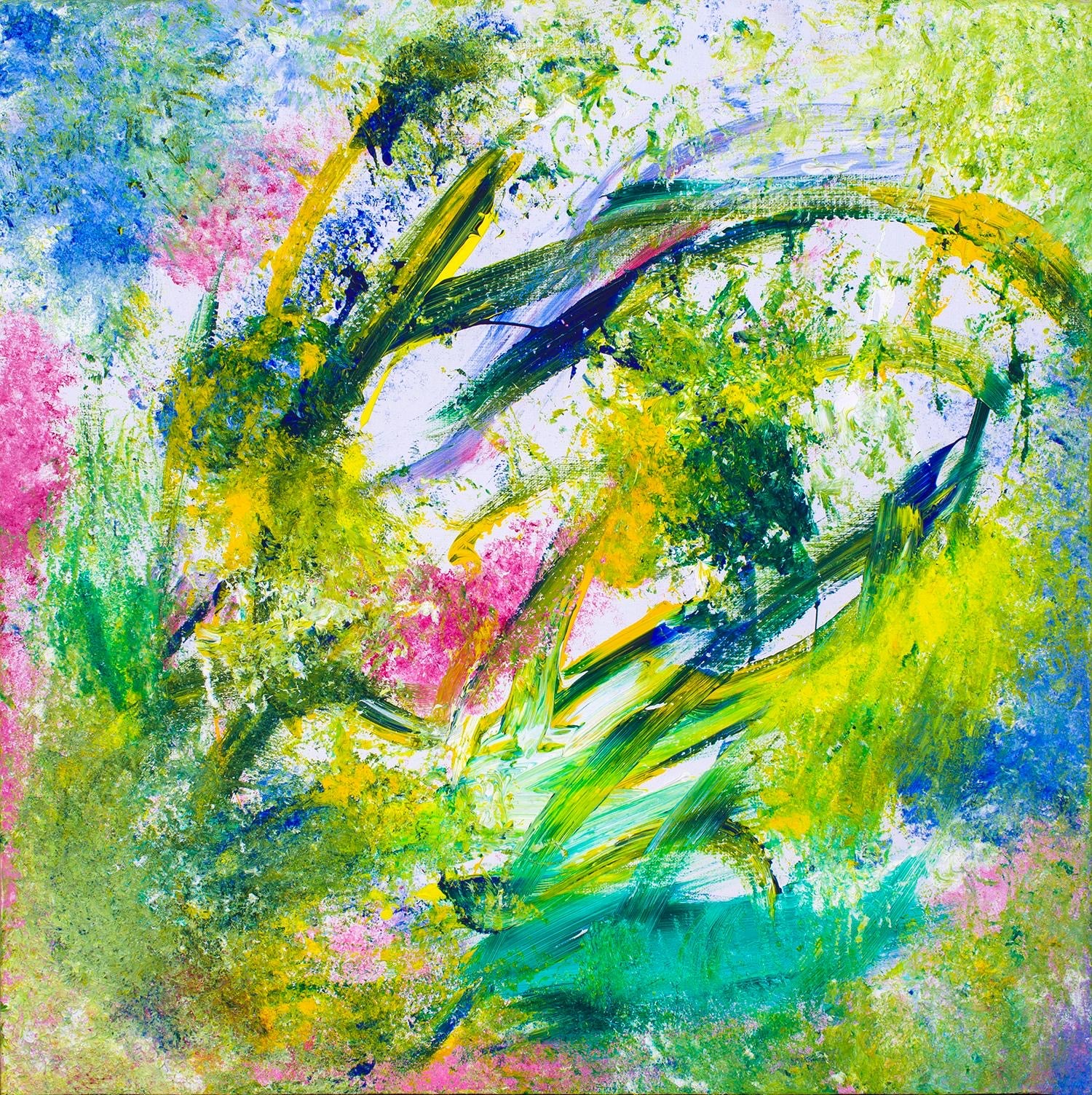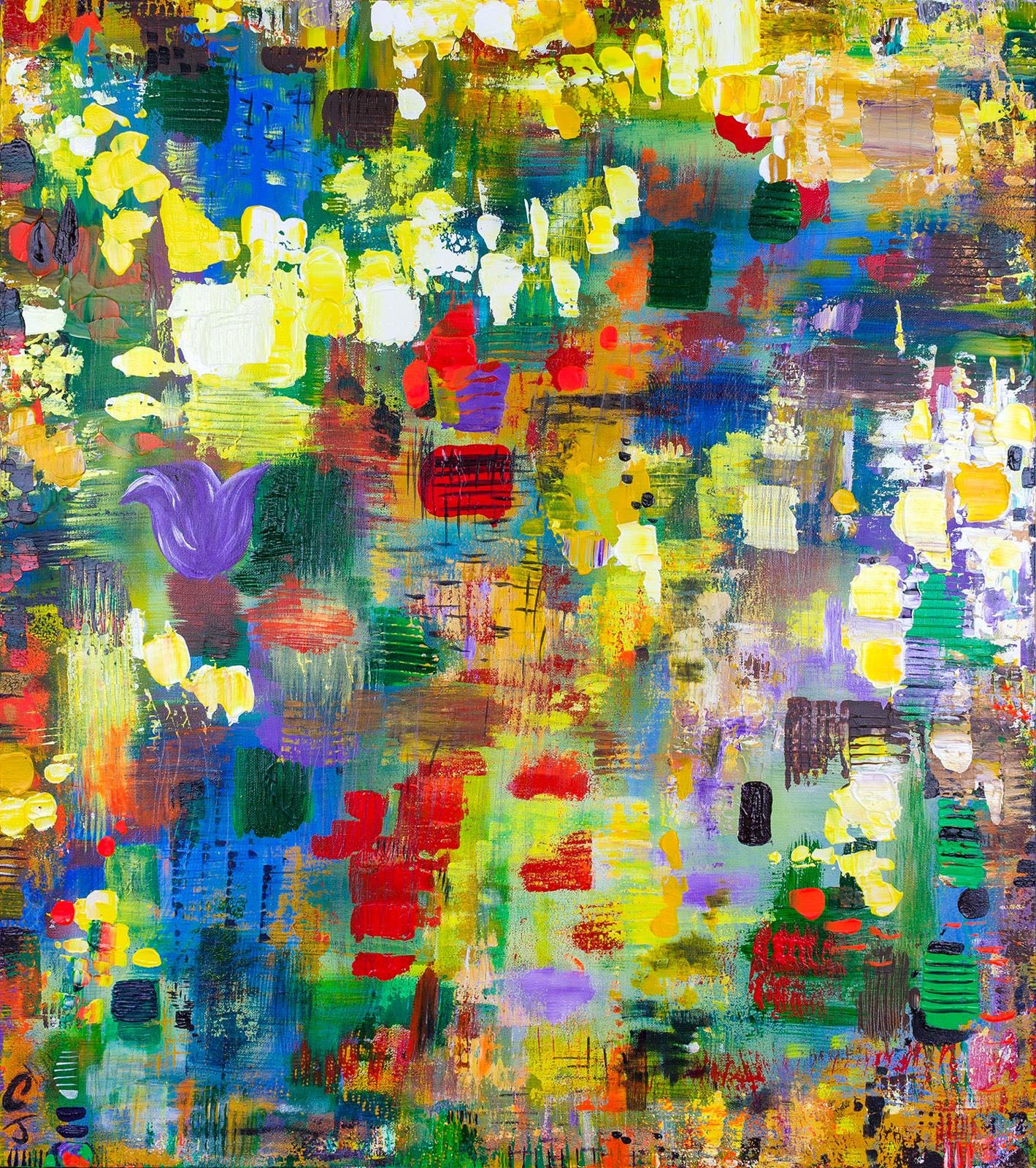 Description: Ripple is a vibrant, multi-layered abstract work that explores the complexities and interwoven stories of life. Bright yellows, vivid blues, and lush greens dance across the canvas, forming large circular brushstrokes that ripple outward like waves on water. These sweeping strokes overlap and intersect, creating a sense of movement and depth, as if multiple stories or moments are unfolding simultaneously within the same space. Clo masterfully uses the brush to create layers upon layers of paint, inviting the viewer to dive deeper into each ripple, uncovering hidden details and meanings within. The circular patterns suggest how life's moments are interconnected, how one event ripples into another, and how every experience has multiple facets. Through this piece, Clo emphasizes the idea that life is not linear but filled with overlapping emotions, memories, and narratives, each flowing into the next, creating an ever-evolving, beautiful complexity.