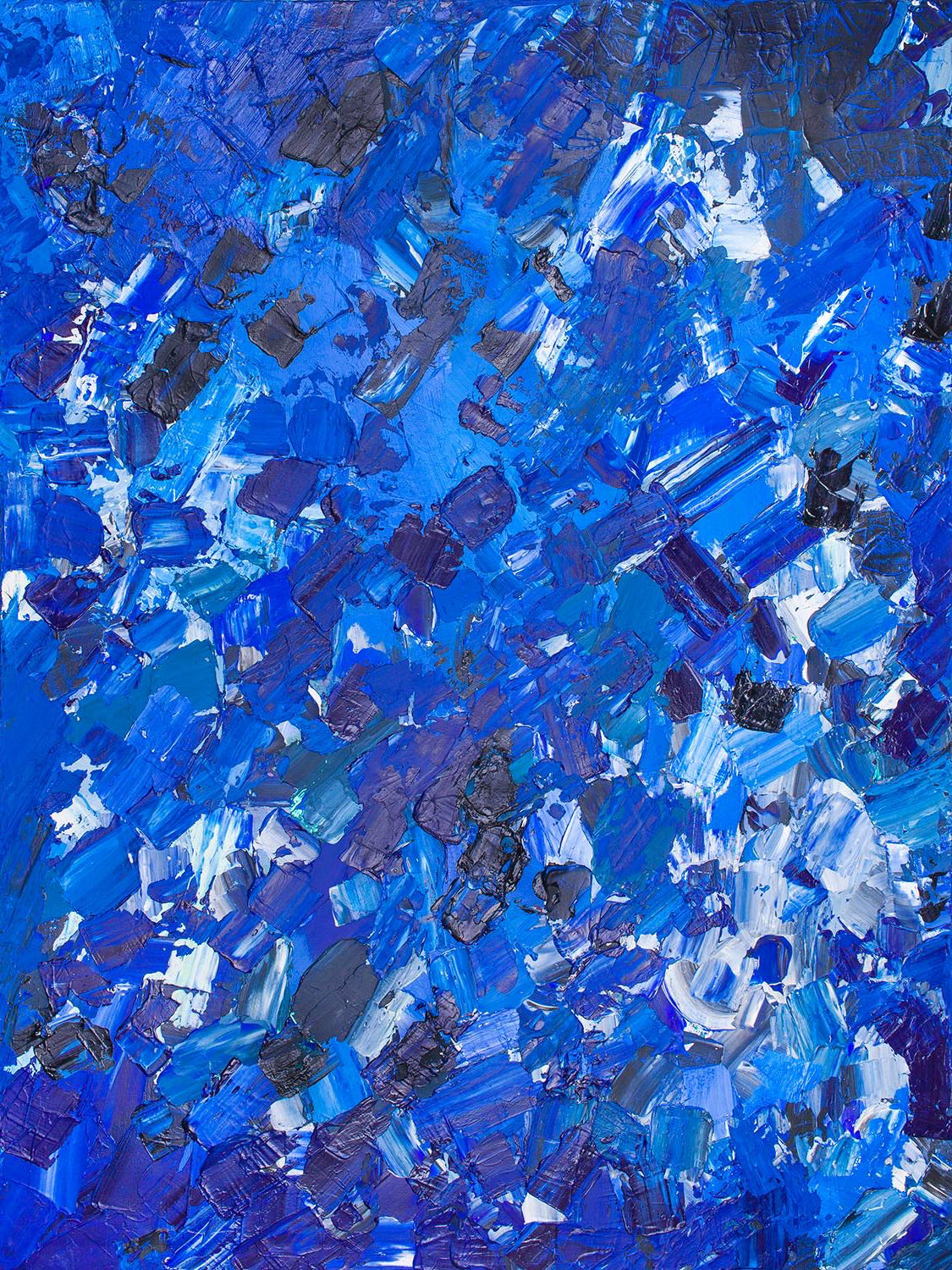 Description: With a dominant palette of dark and light blues, Reflections Beneath draws inspiration from the shifting and mysterious qualities of water. Thick, textured paint dabs form abstract shapes reminiscent of rippling waves or reflections on the surface of a body of water. The darker shades evoke a sense of depth and introspection, while lighter blues suggest clarity and revelation. Clo used various tools—palette knives, fingers, and even water-soaked cloths—to manipulate the paint, mimicking the flow and movement of water. This piece captures the quiet moments of self-reflection, where the surface of the mind can appear calm, but beneath, there is a world of hidden depths and unseen currents. The abstract quality of the piece invites the viewer to dive into their own thoughts and emotions, mirroring the experience of gazing into water and pondering what lies below.