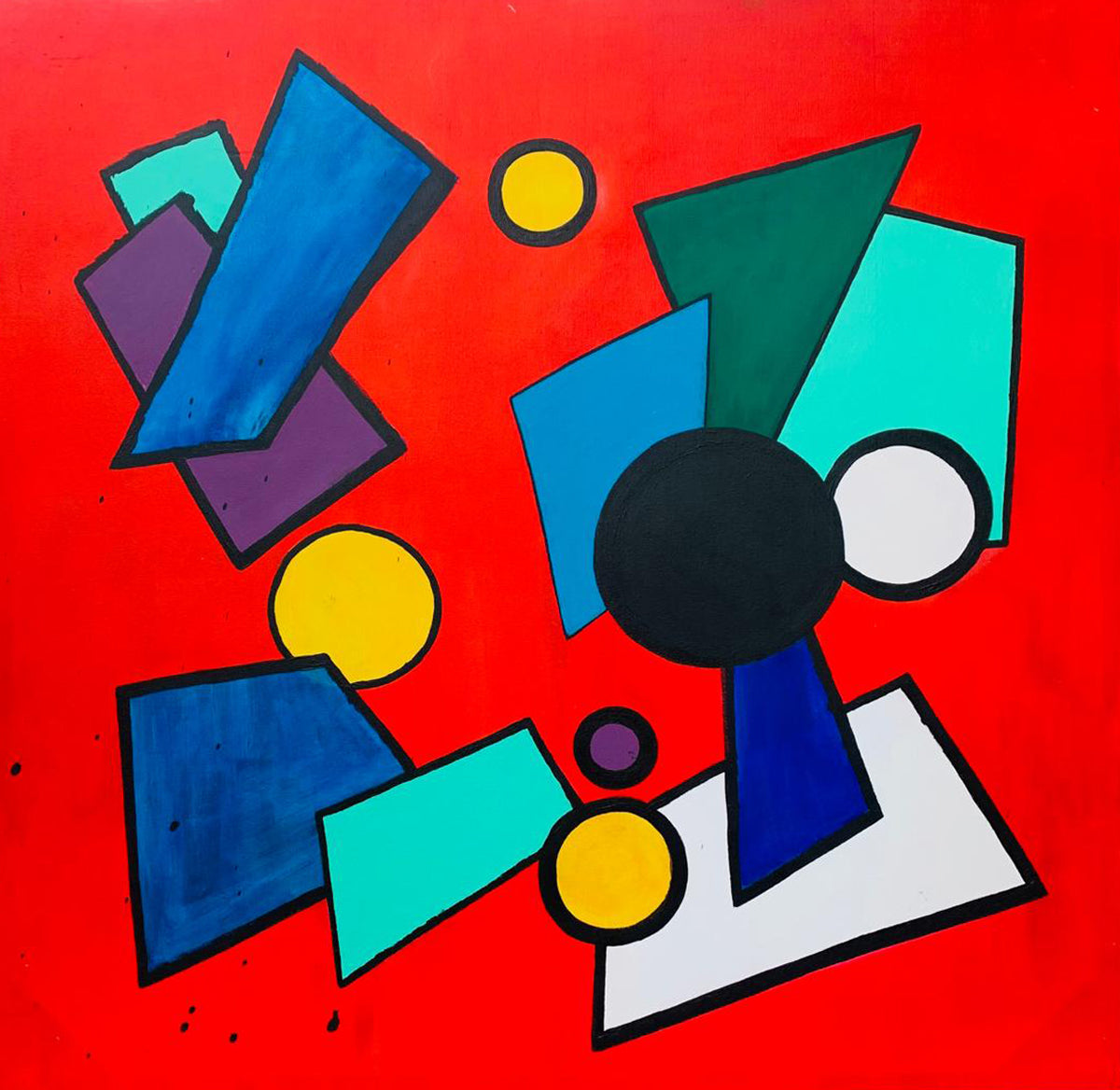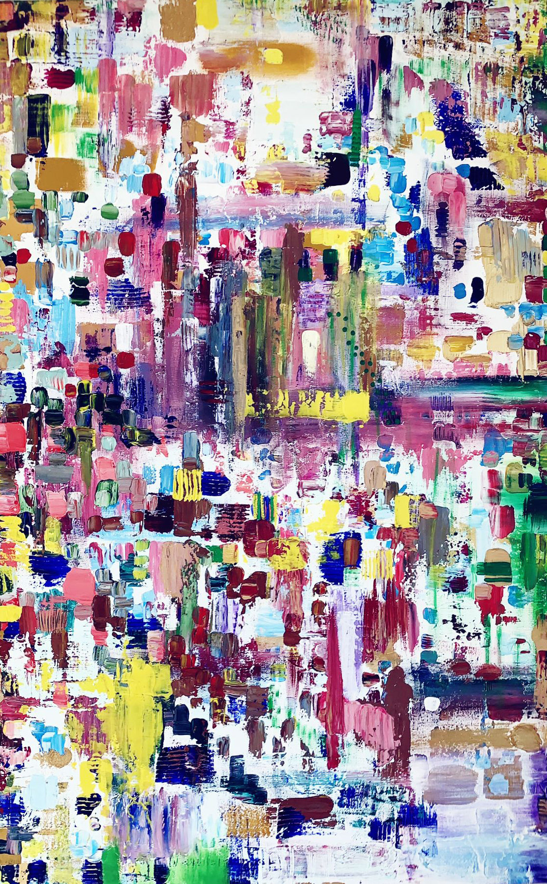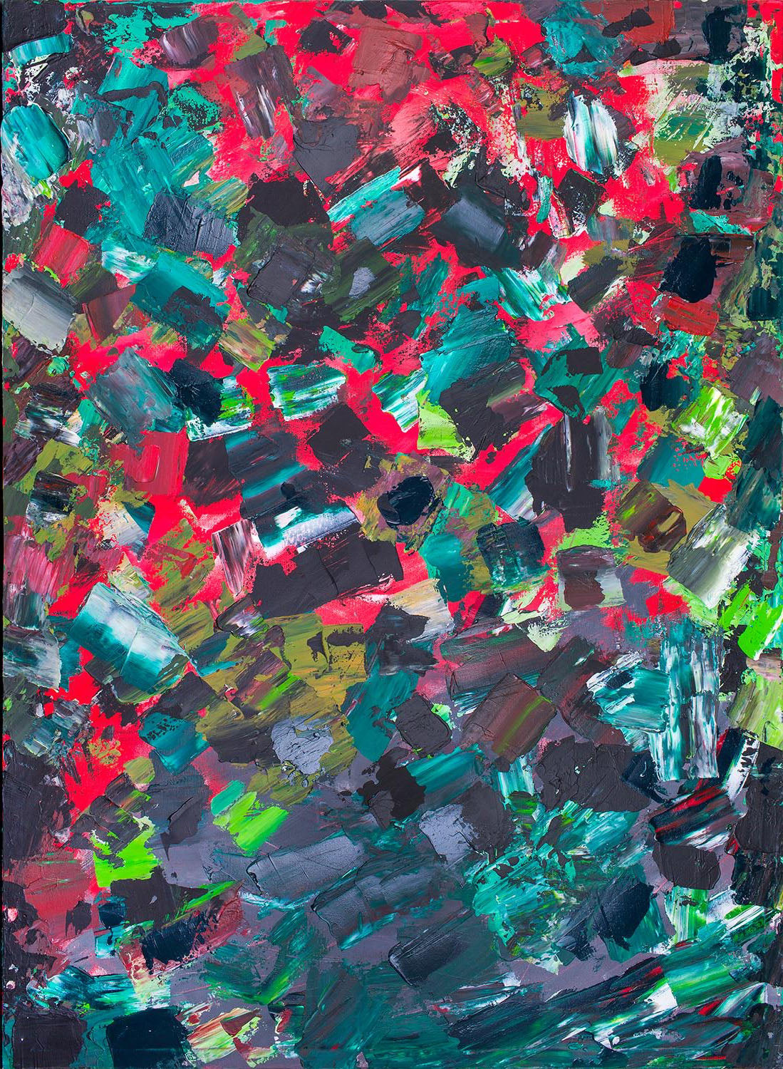 Description: Pulse bursts with energy, a stunning composition of abstract paint dabs that resemble a vibrant quilt of colors and textures. Clo’s use of reds, blues, and greens, along with her inventive application of tools—forks, knives, and various brushes—results in a patchwork effect that is both chaotic and harmonious. The cubic, square-like dabs of paint seem random at first glance, but upon closer inspection, they come together to create a cohesive whole, much like the fragmented moments and experiences in life that, when viewed from a distance, form a unified narrative. This piece is heavily textured, with layers of paint built up through a methodical yet playful process, giving it a tactile, three-dimensional quality.