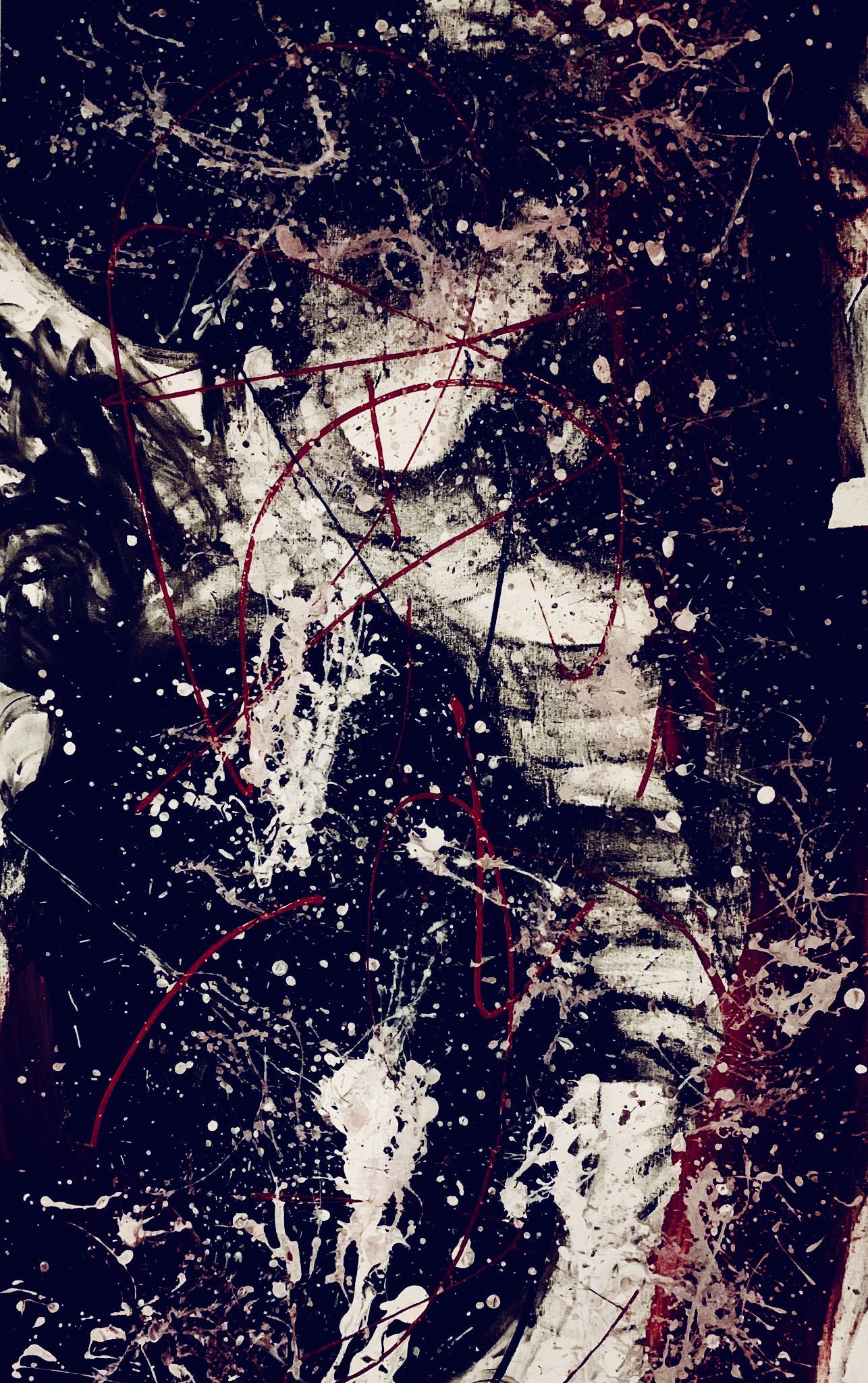 Description: Created in the heat of the moment with the Rolling Stones blasting in the background, this painting exudes raw, rebellious energy. Clo splashed black, charcoal white, and red across the canvas using a mop, followed by delicate splatters of stars, creating a universe of chaos and creation. Red strikes and splashes add a fiery burst of anger and release, capturing the emotion of the music and the artist’s state of mind. This is art in its most visceral form—freedom, rebellion, and passion all expressed through bold, physical movements.