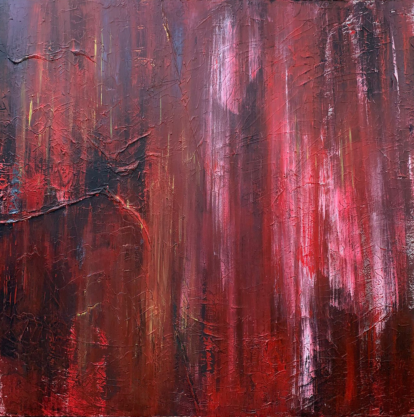 Description: This striking composition of red, black, and charcoal grey bursts with emotion. Using texture, acrylic, and charcoal, Cho employed a palette knife to carve her feelings into the canvas, with white wax crayon adding subtle highlights. A continuation of her rebellious, energetic style, this piece was also created with the Rolling Stones in the background, merging rock-and-roll energy with the artist’s explosive expression. The result is a bold, unapologetic work of art that demands attention.