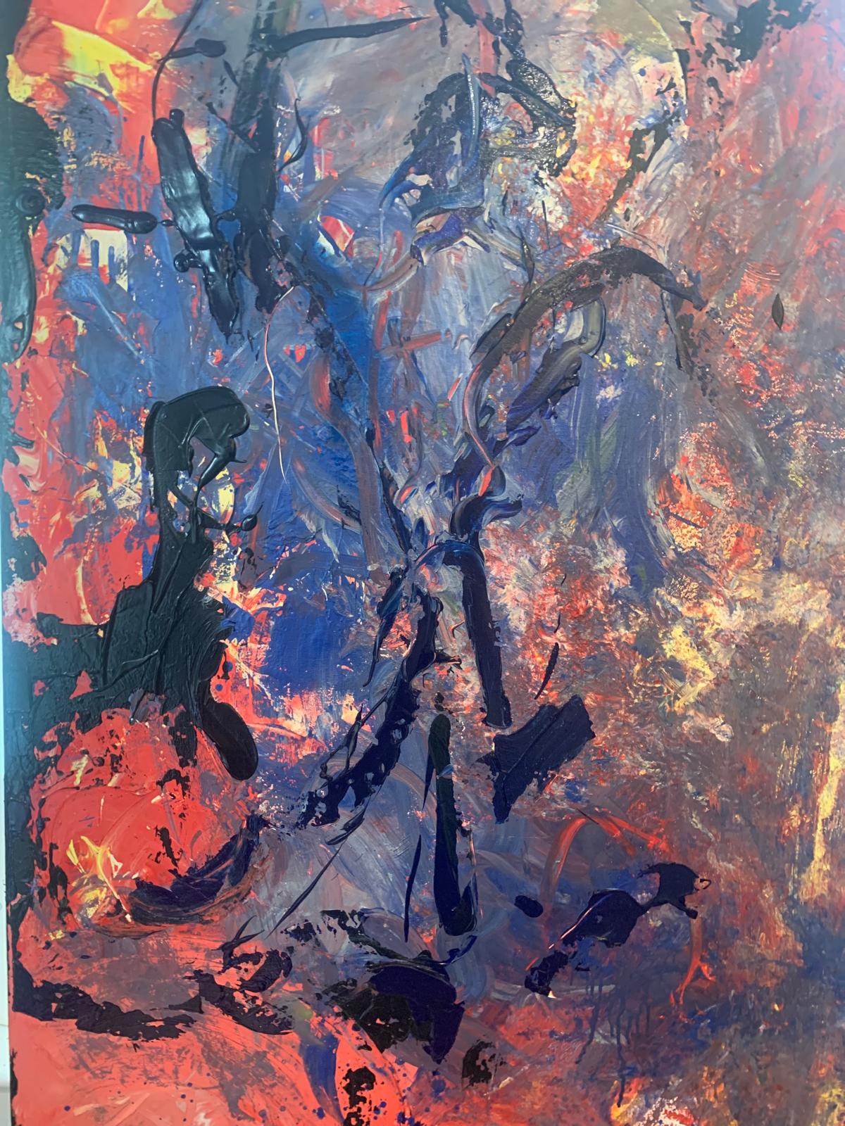Description: This piece is a reflection of Chloe’s complex relationship with the art world. The Eye of the Beholder features bold strokes of colours—blues, oranges, and deep reds—that overlap in chaotic yet harmonious patterns, much like the contradictions Chloe feels as she navigates the art scene. She uses household objects to create uneven textures, signifying her feeling of being out of place in the formal, structured world of galleries and critics. The swirling patterns suggest a sense of movement, representing the constant flux of opinions, trends, and judgements in the art world. This piece embodies Chloe’s frustration but also her reverence for the subjective beauty of art.