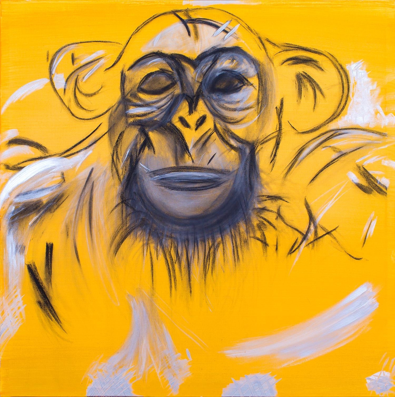 Description: Yellow Play is a striking departure from Clo’s other works, with its minimalist, illustrative style and a bold yellow backdrop that dominates the canvas. At its center is a fluid, almost whimsical depiction of a monkey’s face and shoulders, rendered in black paint or charcoal, with white acrylic dashes that bring the creature to life. The Picasso-esque lines are loose, playful, and spontaneous, suggesting a creature caught mid-thought, or perhaps on the verge of action, as if it's just emerged from the artist's subconscious. The yellow background provides a stark contrast to the black lines, creating a sense of warmth and vibrancy, while the free-flowing nature of the monkey’s form invites the viewer to reflect on the boundaries between imagination and reality. Clo’s choice to leave the image feeling "unfinished" adds a layer of mystery, as if the monkey is a fleeting thought or a passing moment of creativity, captured before it could fully materialize. The piece is playful yet contemplative, offering a glimpse into the mind’s wandering nature and the spontaneity of creation.