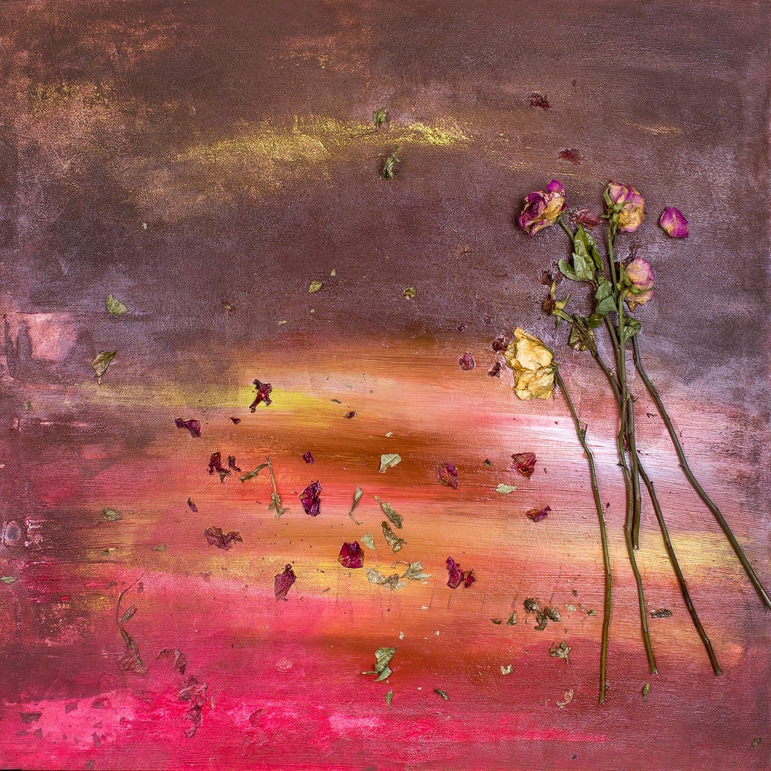 Description: Love Lost features a glowing sunset-like backdrop of peachy reds, pale purples, and dark browns, creating a soft, ethereal atmosphere. In the foreground, a bunch of roses appears to be caught in mid-air, with petals seemingly floating away from the bloom, suspended in the breeze. The roses, with their rich reds and gentle pinks, symbolize the fleeting nature of beauty and life, and how moments of stillness can evoke powerful emotions. The flowers are painted with delicate precision, but the flowing petals add a sense of freedom, as if they are being carried away by the wind. Clo used dried rose petals, integrating them into the paint to give the artwork a textured, three-dimensional feel, bridging the gap between the natural and the abstract. The painting embodies themes of vulnerability, beauty, and the transitory moments that define our existence.