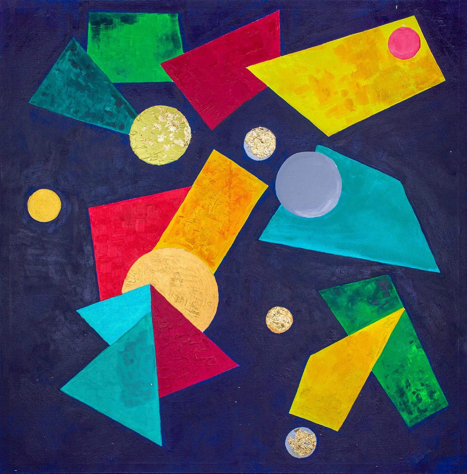 Description: Cosmic Ballet is a playful exploration of the universe, with a deep blue background speckled with vibrant reds, yellows, and circular shapes that resemble planets and stars. The circles float through the canvas like celestial bodies drifting through the cosmos, while abstract shapes suggest movement, transformation, and the possibility of something beyond the visible world. Clo used various round objects—balls, lids, and even fruit—to imprint circular patterns into the paint, creating a whimsical, almost childlike depiction of space. The background hints at a sky full of mystery, while the colourful orbs offer a sense of joy and curiosity. The painting speaks to the wonder of the unknown and the excitement of exploration, whether it’s through the stars or the inner realms of the mind..